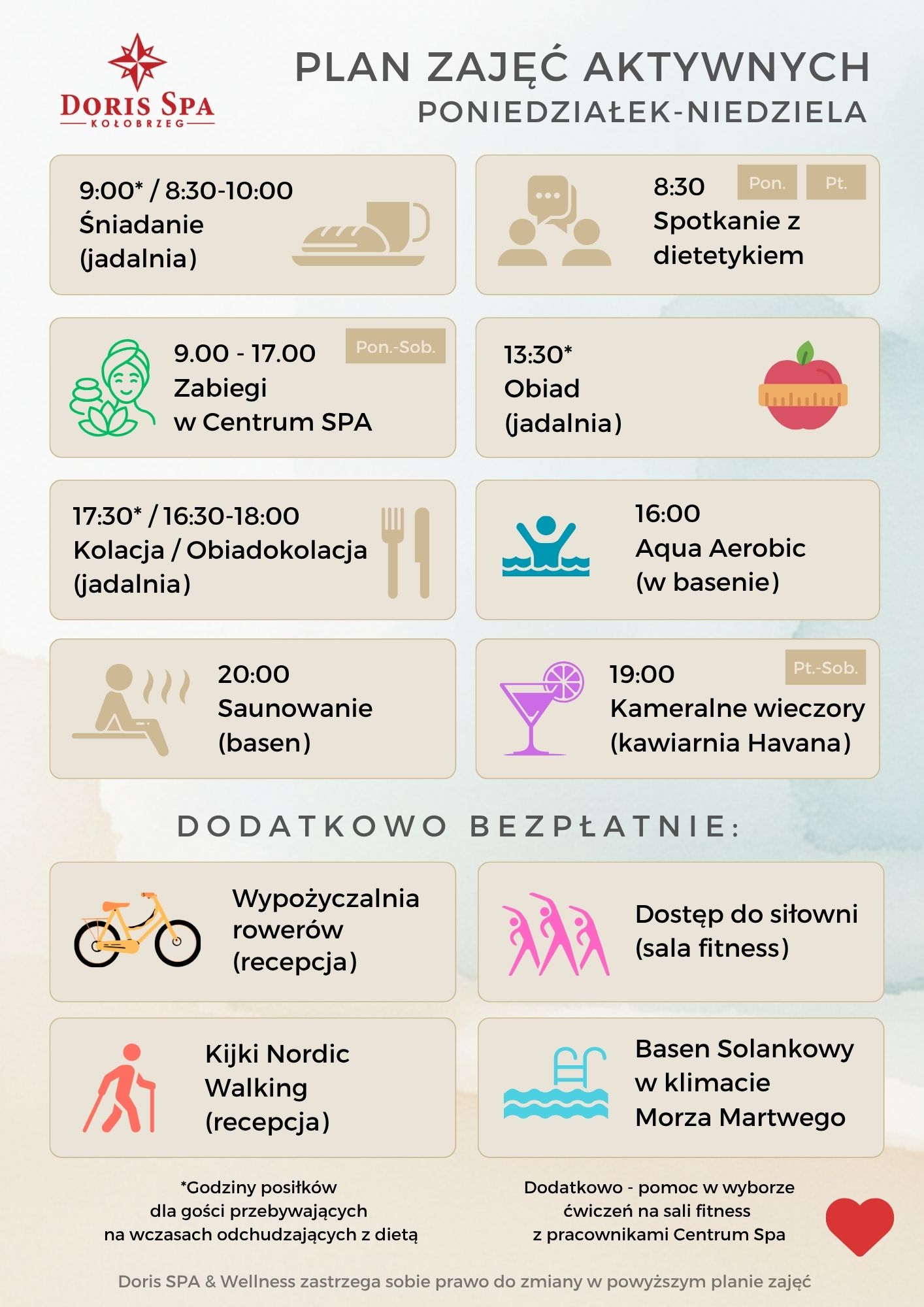 Zadbaj o formę, uczestnicząc w zajęciach fitness prowadzonych przez naszych instruktorów (poniedziałek-piątek) w basenie oraz w sali fitness wyposażonej w urządzenia treningowe. W przypadku grup poniżej 8 osób sala fitness jest dostępna do samodzielnych ćwiczeń.